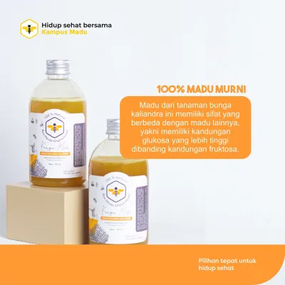 Madu Murni Kaliandra dipanen dari sarang lebah Apis mellifera dari nektar mengikuti musim dan vegetasi alam (saat ini nektar randu) Nama sesuai dengan nektar bunga yang di ambil / dimakan lebah. Tekstur dan warna tidak selalu sama, karena produk panen hewan ternak bukan pabrikan. Aroma dan Rasa khas.